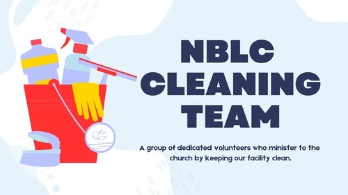 The NBLC Cleaning Team does an amazing job ministering to our church by keeping the facility clean! Team members commit to serving one day of the week per month for two hours. Training is also provided. If you are interested in being apart of the NBLC Cleaning Team, please contact Vicki Langner directly at vicki@nblakeside, or sign up to serve by clicking the button below and selecting "Cleaning Team."